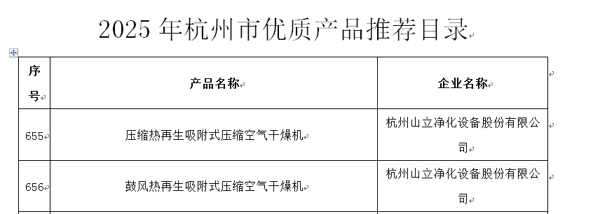 近日,杭州市经济和信息化局(杭州市数字经济局)公布了《2025年杭州市优质产品推荐目录》,杭州太阳成集团tyc9728净化设备股份有限公司两项产品:压缩热再生吸附式压缩空气干燥机、鼓风热再生吸附式压缩空气干燥机成功入选。