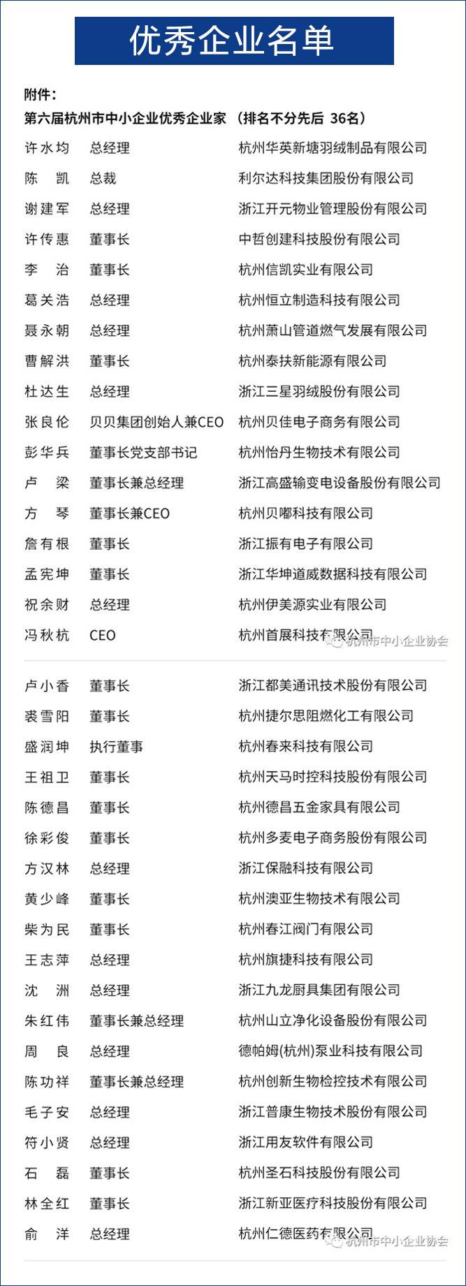 近日,各区(市)中小企业管理部门推荐,杭州市中小企业协会评选委员会认定,第六届杭州市优秀中小企业和企业获奖名单正式公布,我司董事长朱红伟先生名列其中。(优秀企业家获奖名单见文末)